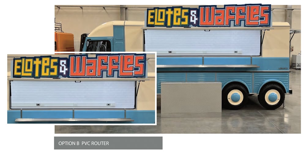 Routed PVC material 1/2 with full color printed vinyl on first surface Installed to stainless steel structure with hinges (ready to install at food truck)